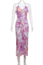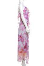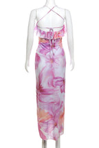 A woman wearing a floral print midi dress with spaghetti straps and a V-neck top, standing in a sunny location with brick walls in the background.